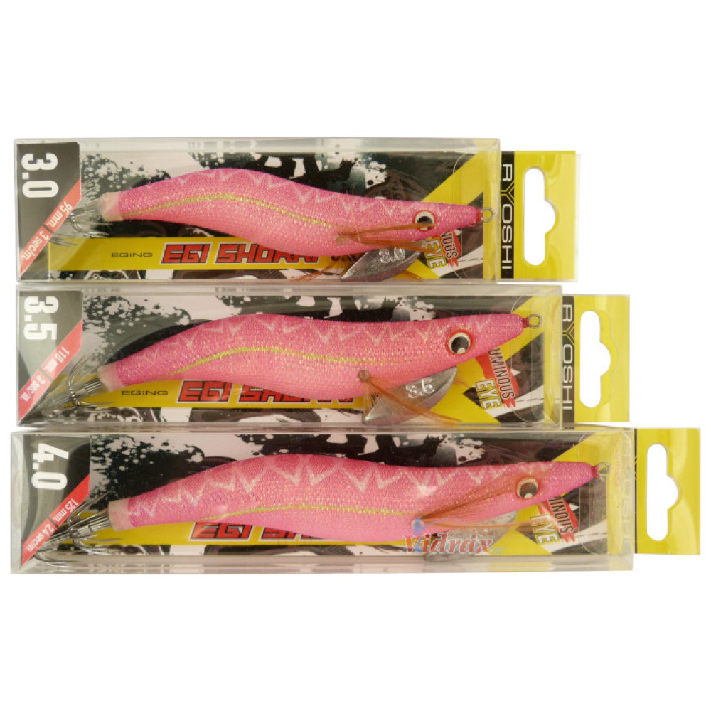 Калмарети EGI SHOKKI на RYOSHI са насочени към всеки тип рибар, който иска да допълни своята кутия със стръв за риболов на калмари или сепия. SHOKKI имат компактен и хидродинамичен дизайн, реалистичен профил, флуоресцентни цветове, флуоресцентни реалистични очи и остри куки с двойна корона от неръждаема стомана. Изработени са от издръжливи и устойчиви материали, каквито харесват калмарите и сепията. EGI SHOKKI на RYOSHI са с ефектни цветове и блясък. Отлично съотношение цена-качество.