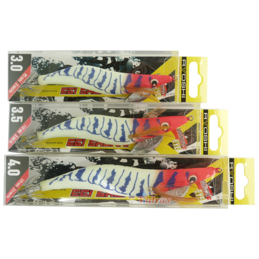 Калмарети EGI SHOKKI на RYOSHI са насочени към всеки тип рибар, който иска да допълни своята кутия със стръв за риболов на калмари или сепия. SHOKKI имат компактен и хидродинамичен дизайн, реалистичен профил, флуоресцентни цветове, флуоресцентни реалистични очи и остри куки с двойна корона от неръждаема стомана. Изработени са от издръжливи и устойчиви материали, каквито харесват калмарите и сепията. EGI SHOKKI на RYOSHI са с ефектни цветове и блясък. Отлично съотношение цена-качество.