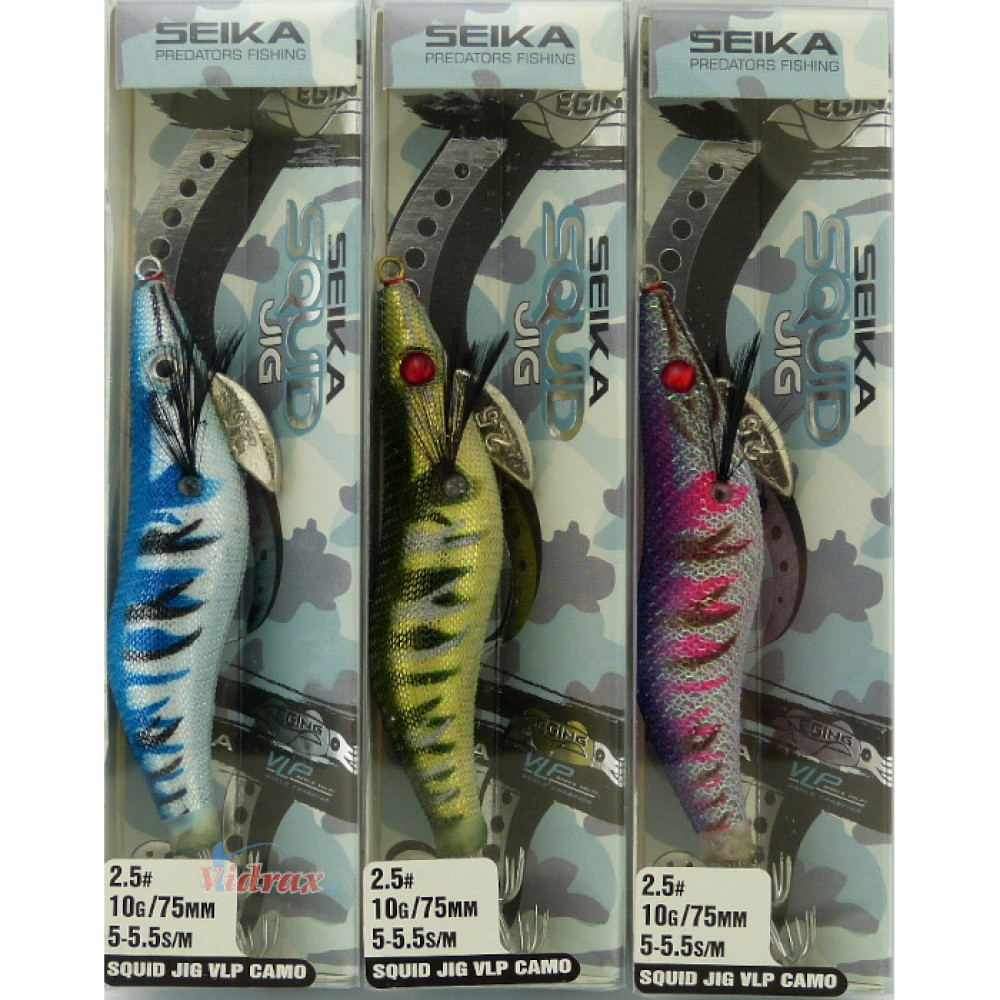Серия калмарети Seika Squid Jig VLP Camo, покрити с висококачествен плат, украсени с изключително привлекателни окраски с характерен "Camo" ефект. Формата на тежестта позволява перфектен ъгъл на наклон от 45° и оптимална игра при търсене на сепии и калмари. Балансът на тежестта осигурява бавно потъване и отлични възможности за замятане при риболов от брега. Оборудвани са с двойна корона от много остри и проникващи куки, които минимизират риска от откачане на главоногите по време на изваждането. Флуоресцентна лента на гърба и светеща точка в основата на куките придават на примамката още по-забележим вид.