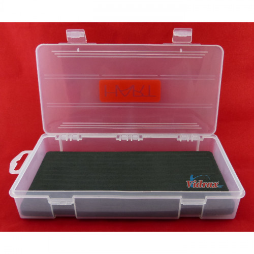 Пластмасова кутия с вложка от пяна, за да държи калмаретите на място. Страхотно качество и дизайн.