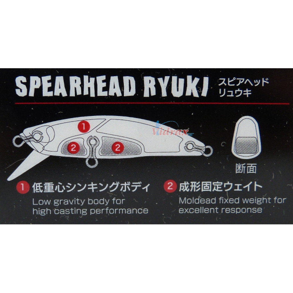 Нов модел потъващи воблери DUO Spearhead Ryuki от серията Sperhead, предназначени за спининг риболов на дребни хищни риби. Дължината на тялото му е 46 мм, а теглото 5 грама. Има заоблен корем и фиксирани утежнения, които подобряват кастинга и устойчивостта на течение. Движи се с изразена собствена игра с голяма амплитуда. Spearhead Ryuki 46S се произвежда в разнообразни цветове, които да подхождат на различна осветеност и цвят на водата. В асортимента има както натурални цветове, така и по-тъмни, и по-ярки.