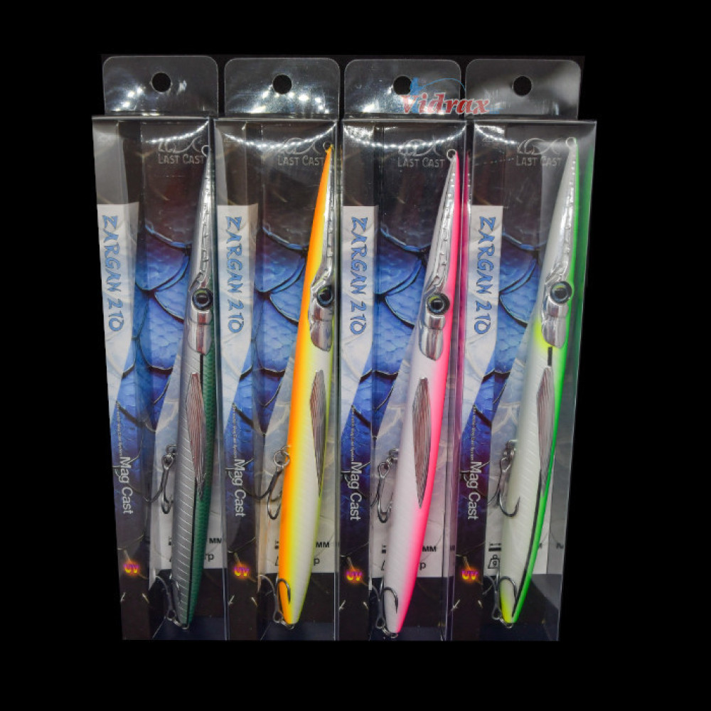 ZARGAN 210 - Прецизно конструирани примамки, с отличен баланс, със забележителни кастинг дистанции и още по-впечатляваща реалистична и апетитна игра на повърхността. Притежават 3D изразителни очи, уникални краски, качествени тройни куки и магнит в средата, който спомага за увеличаване на дистанцията при замятане. Имат страхотна игра както на бърза, така и на бавна проводка. Примамки, които лесно ще разбудят духовете във водата, а и Вас ще въвлекат в действия и битки.